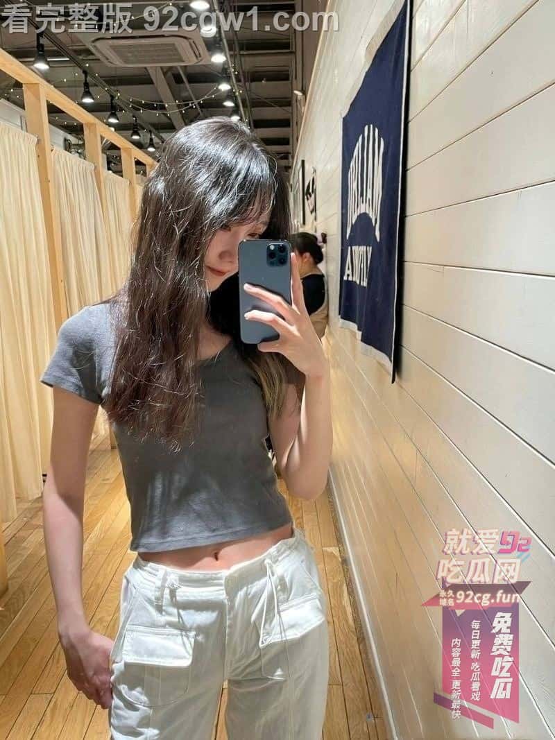 这小姐姐绝对是极品中的极品,长相甜美清纯,五官精致像混血娃娃,照片里在试衣间镜前自拍,穿一件紧身灰色短T恤露出平坦小蛮腰,下身白色工装裤低腰勒出臀线,长直发披肩皮肤白得发光,身材前凸后翘比例完美,一看就是那种走在街上回头率爆表的女神类型。